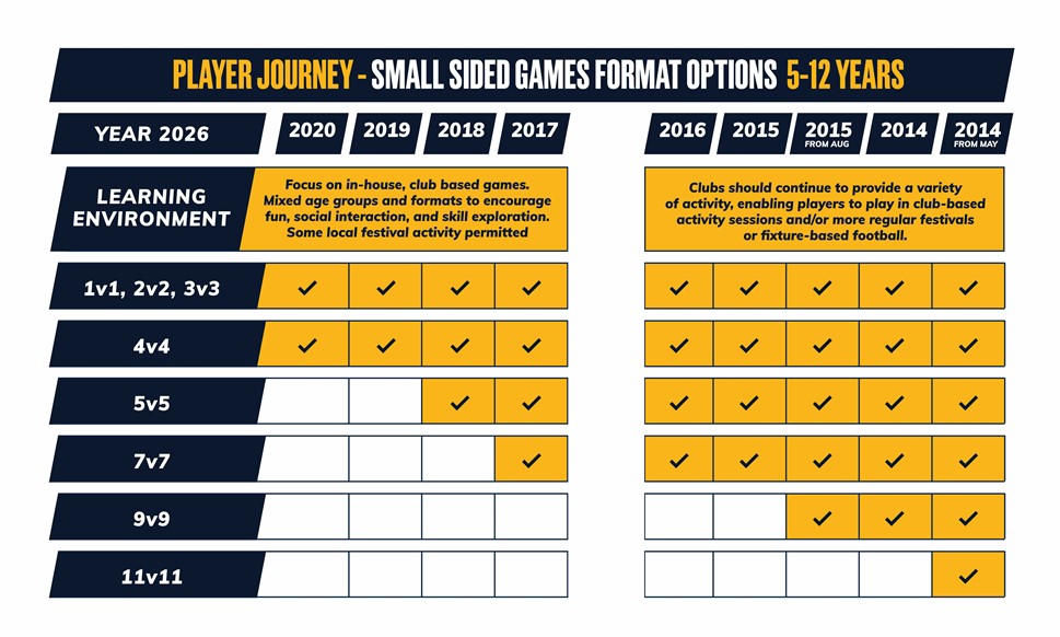Clubs are encouraged to offer informal, come and try football centres for their young people. For more committed players, clubs, leagues and associations can also offer more structured games, festivals and fixtures. There is no “one size fits all” in children’s football. Each child will have a different journey, depending on their level of interest, commitment and ability.