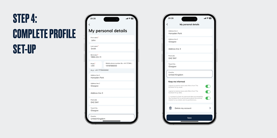 To delete your account, you will find the ‘Delete Account’ button under ‘My Profile’. Press ‘DELETE’ to continue. Please note that tickets associated with your account and personal data collected by the Scottish FA & TIXNGO will be permanently deleted and cannot be recovered.